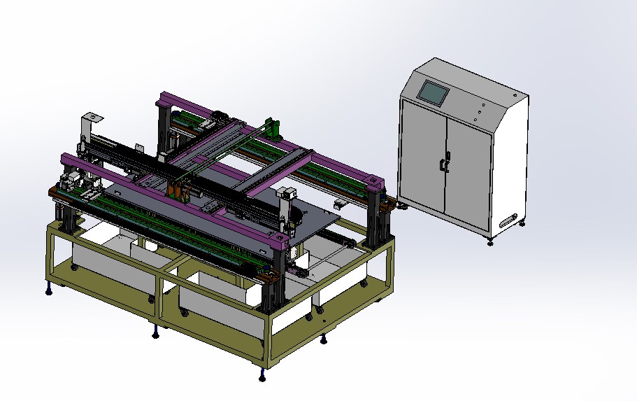 自動排版機的主要功能單元有:玻璃輸送定位系統(tǒng)、抓取行走系統(tǒng)、視覺檢測系統(tǒng)、電控系統(tǒng)等;通過以上功能單元,實現(xiàn)了將自動串焊機串焊好的電池串,按照工藝尺寸要求和排版方向順序自動排版鋪設到玻璃(EVA已經(jīng)鋪設)上,組成電池串陣列。玻璃/EVA通過傳輸線傳輸至指定位置,機械手抓取電池串實現(xiàn)CCD定位、自動旋轉(zhuǎn)、自動排版功能。設備通過同步帶傳輸與自動生產(chǎn)線對接,實現(xiàn)了自動流水作業(yè)。